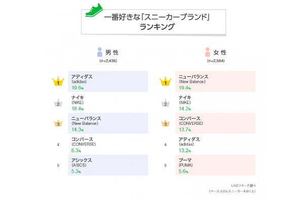 好きなスニーカーのブランドランキング 男性の1位はアディダス 女性の1位は Dime アットダイム